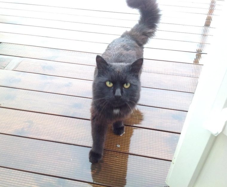 Katten kommer for å få mat og vann også går den igjen. Han har masse pelsballer i pelsen sin.