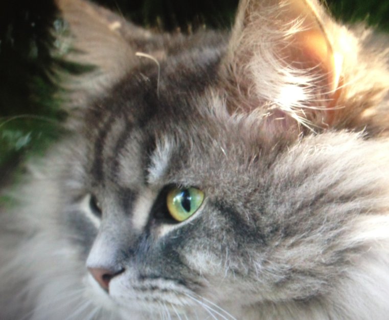 Hun har halvlang pels med løvemanke, gråblå farge med gyllent, svakt tigermønstret. Hvite værhår og dotter i ørene og mørkere, stripet hale.