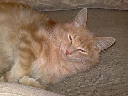 Lodden kosete pus, lyserød/oransje i pelsen. Nykastrert og nettopp blitt ID-merket med chip.