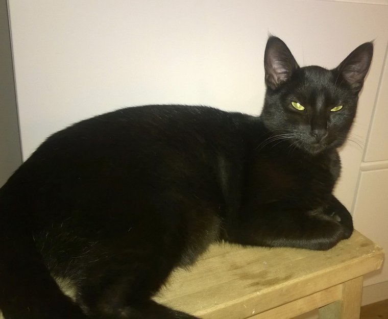 Oscar er helt sort. Han har et smalt fjes, og litt lang hale. Er halvt huskatt og halvt skogskatt. Han er chippet, og har en ID tatovering i venstre øret.