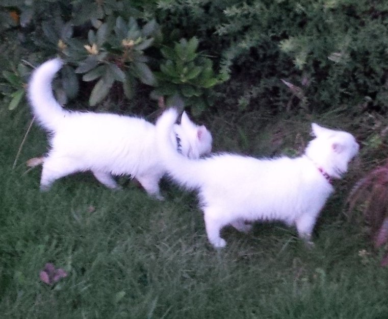 2 sultne og tørste hvite kattunger dukket plutselig opp i hagen ca. kl. 19:30. De ble også observert et annet sted på boligfeltet rundt kl. 18:00.