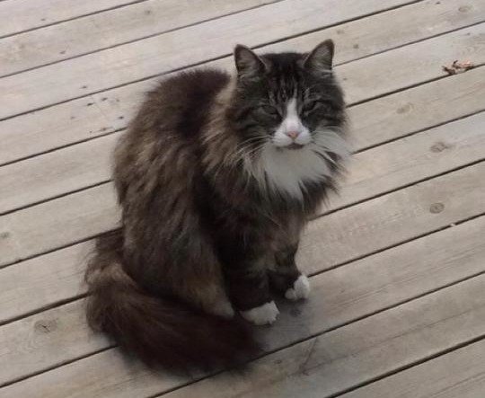Langhåret hannkatt. Kastrert. Svart/hvit spraglete, pelsen ser ofte lysere ut ute. Hvit pels på magen, brystet og på alle fire potene. Rosa nese. Han er ganske sky ovenfor fremmede, så han vil nok ikke gå bort til/oppsøke fremmede folk.