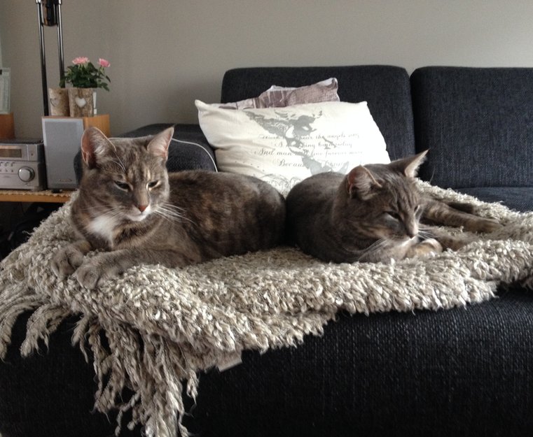 OBS: Vi har en katt til som er broren hennes, må ikke forveksles med han. Han er mye jevnere i gråfargen, og har ikke innslagene av brun/oransje i pelsen. (Se bilde, Frøya til venstre, broren til høyre)