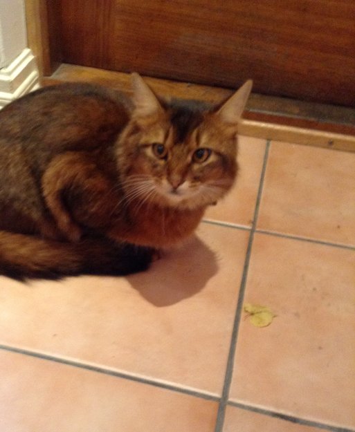 Kosete liten rød katt har holdt seg rundt huset vårt siste døgnet. Vi har selv katt og har derfor ikke tatt den inn. Slitt halsbånd uten navn.