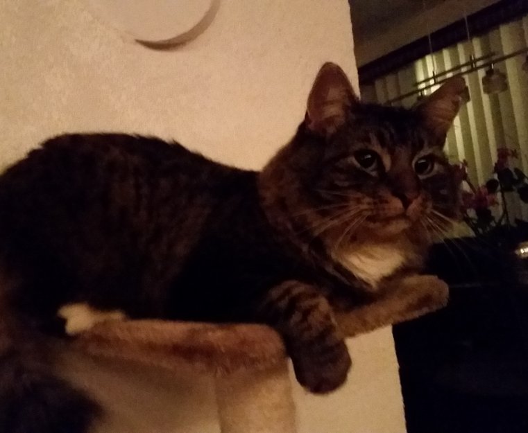 Liker mennesker. Grønne øyne, har et kutt i det ene øret. Er hvit på brystet og har en hvit flekk på halen. Ellers er han brun og svart.