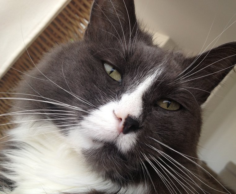 Langhåret, noe kortere på hodet/nakken. Grå med hvit snute/mage/poter. Assymetrisk hvit tegning på snute, se bilde. Veldig kosete. Lyder "navnet" pus/pysen.