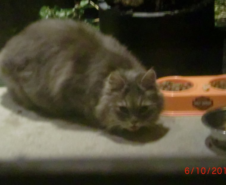 Denne nydelige grå langhårete katten dukket opp på trappen min på Fjell (Søre Fjellavegen) den 06.10.14 og har kommet hver kveld siden for å lete etter mat. Den er veldig sky (bildet tatt gjennom vindu). Den spiser og løper når den ser meg i vinduet, men kommer tilbake straks for å "sluke" mer mat.