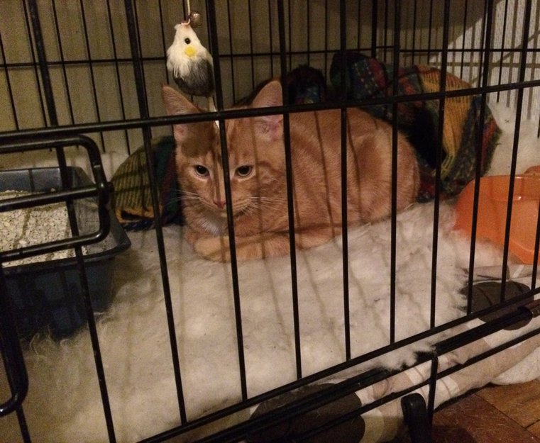 Han har vært utenfor hos oss i 2 døgn nå. Virker ikke som han vet veien hjem da han fotgølger meg overalt. Han er tatt inn til oss over natten slik at han kan få varme. Han er et par mnd gammel max.