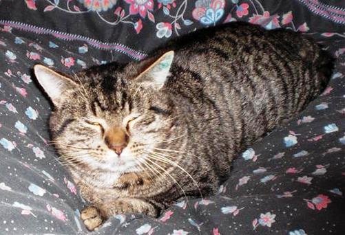 Bruntigret snill hannkatt. Hadde opprinnelig blått halsbånd med hylse, men hylsetoppen har trolig ramlet av.