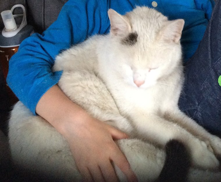 Hvit, kastrert hannkatt med sort hale. Har også en liten sort prikk ved det ene øret. Kommer hvis man roper "mat".
