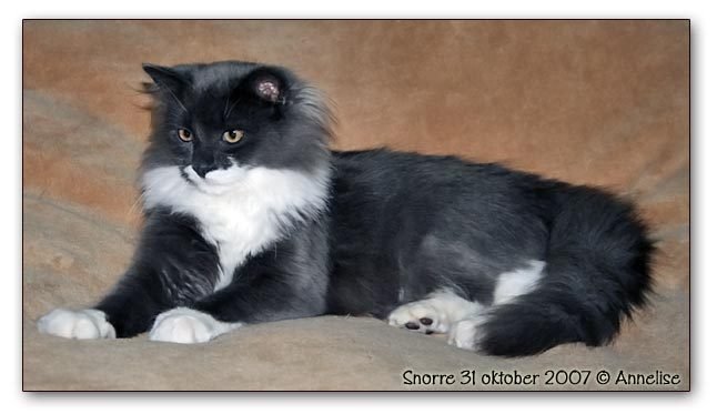 Hjemmekjær men mye ute. Lang pels (stålgrå). Sky/redd fremmede.