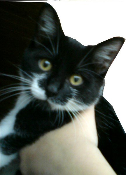 Svart på ryggen og halve ansiktet. Hvit under magen å på brystet. En ganske liten hunn katt.