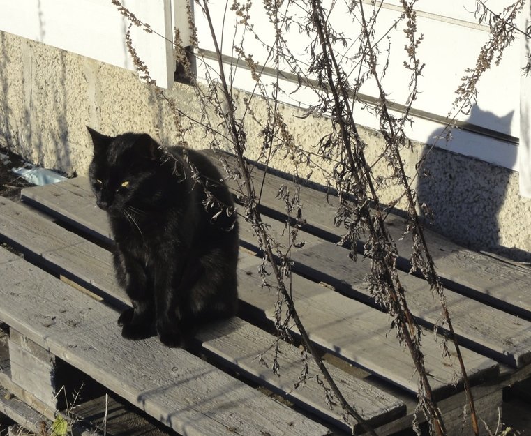 Noen få hvite hår på brystet, stort sett veldig pratsom. Blank i pelsen, gule øyne.