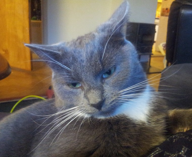 Liten og nett. Lys grå, korthåret, 4 hvite poter. Hvitt bryst, hvit stripe fra bryst og opp til ene munnviken. Sky.
