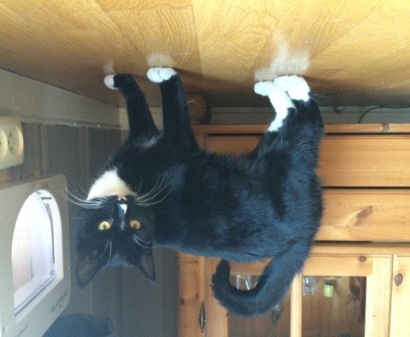 Miss er svart med hvite poter, litt hvitt på magen og på nesen.