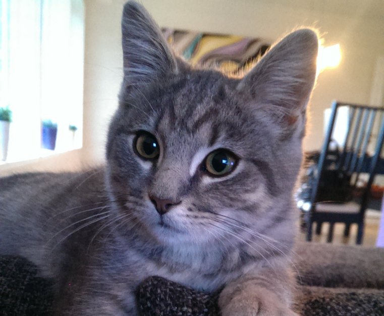 Gråstripete hannkatt 7 mnd. Kjælen og selskapssyk.