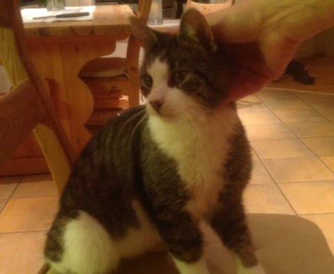 Kom på døren. Har vært inne en ukes tid for mat. Er veldig kosete og husvant. Har sjekket med ett dyrehospital og det er en hankatt, kasterert. Ca 1 1/2 år gammel.