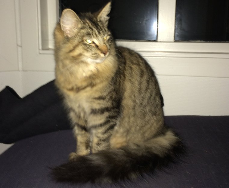 hvitt hår i ørene og på hake. sort på nederste delen av halen. sorte strippe på front beinene