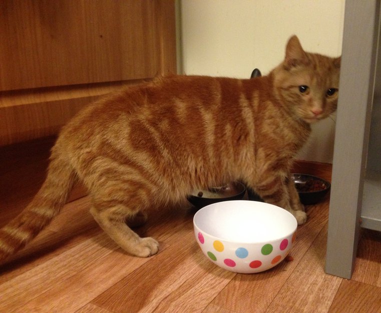 Denne katten henger rundt i borettslaget. Har ved noen anledninger banket på vinduet og også sneket seg inn å spist litt mat. Den virker litt sky, men ikke redd.
