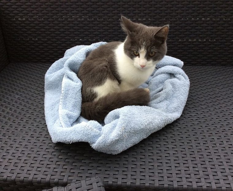 Katten er grå på ryggen, halen og hodet og hvit på beina, magen, brystet, nakken og nedre del av ansiktet. Den har et svart halsbånd, men det står ikke skrevet noe navn på det. Katten er veldig kosete og leken, og trygg på mennesker.