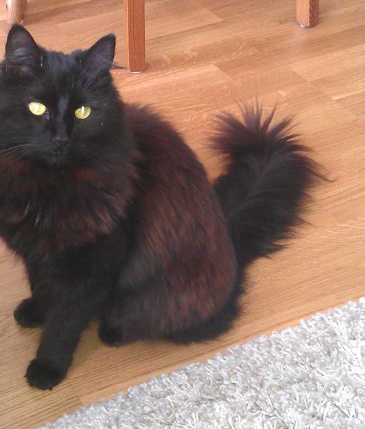 Svart katt, mangler en tann, kastrert,