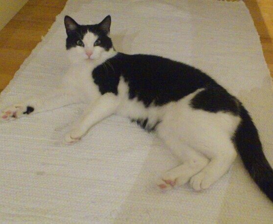 Korthåret svart og hvit hannkatt. Svart flekk under høyre frampote. 11/2 år gammel.