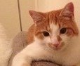 Oransj og hvit hannkatt. 3år gammel. Hvit på magen. Liten flekk på nesen. Er ID-merket.