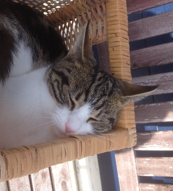 Han var litt forvirret og urolig i tiden etter han hadde kommet hjem men etterhvert fant han tilbake til matfat og sin vante soveplass. :-)