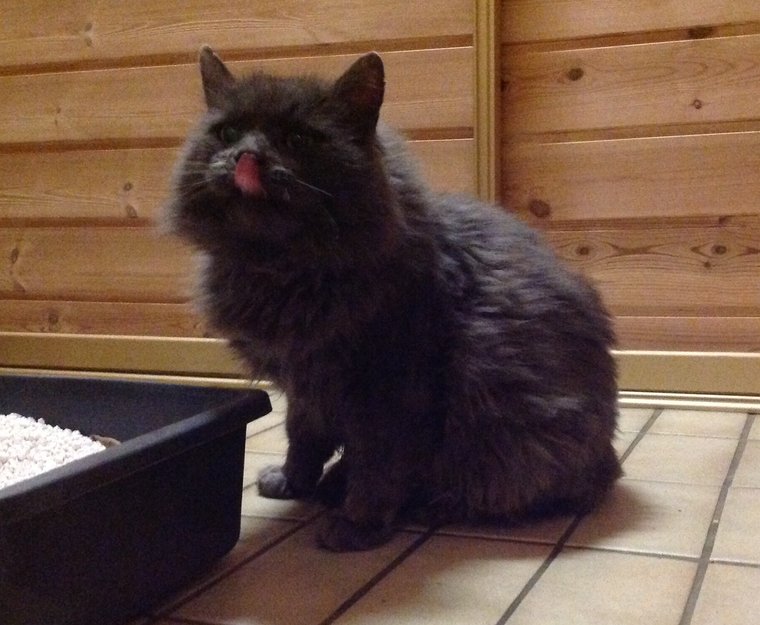 Grå pels, langhåret. Medium størrelse, ganske tung. Tipper alder 5+, kan være eldre. Bærer preg av å ha gått ute en stund da pelsen er svært ustelt. Sannsynligvis ukastrert hannkatt (pga lukt). Virker som om den er vant med folk, men er er nå usikker og litt stressa og vil ikke håndteres. Vi skal prøve å få sjekket den for chip eller øremerking.