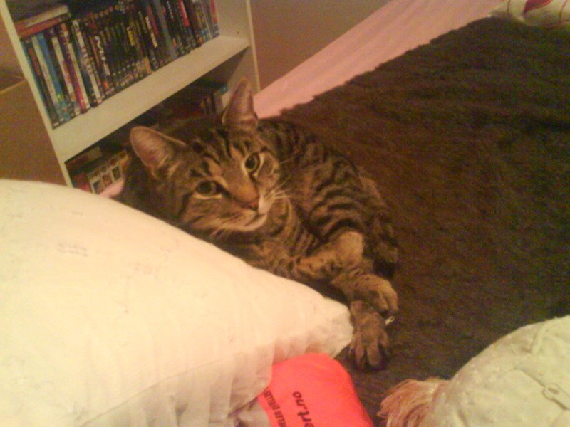 I dag kom han hjem, naboen sa de hørte mjauing også plutselig kom han løpende, det var så godt å se han igjen, veldig sulten men ellers helt fin. Nå ligger han på sengen og maler mens jeg koser med han