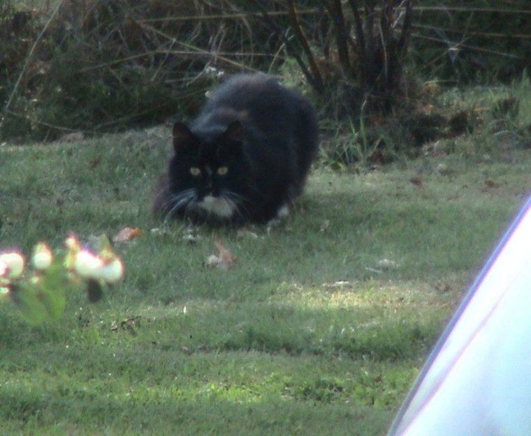 Litt lav katt, men ganske rund. Den har hvitt bryst og hvite poter. I tillegg har den en svak liten hvit stripe på venstre sida på snuten. Har vært veldig sky, men har nå vist seg litt mer tillitsfull.