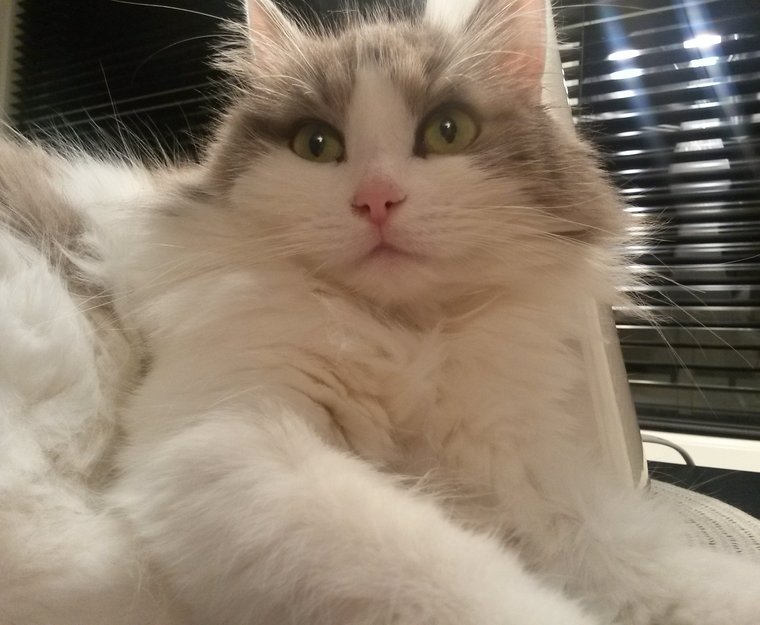 Neela er skeptisk til dem hun ikke kjenner. Hun har hvite poter. Grå hale. Hun er grå på rygg og hode. Hvit mage.