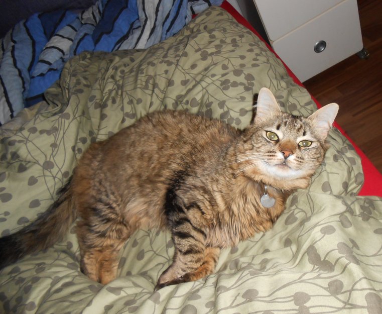 han har noen svarte prikker og striper og har en veldig fin og myk pels,han er litt hvit nederst på magen. og under haka. Han er skeptisk til nye mennesker så tror ikke han ville gått bort til noen ute. Kan være sperret inne et sted så lurt å se i garasjer/boder. Han hadde halsbånd når han forsvant og på halsbåndet så står nr mitt. Men han kan ha mistet det så er jo ingen garanti for at han fortsatt har det på seg.