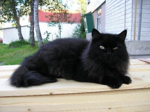 Hun er en helsvart pelsdott med katt inni, har gule øyne og nå på vinteren har hun en enorm pelskrave rundt halsen.