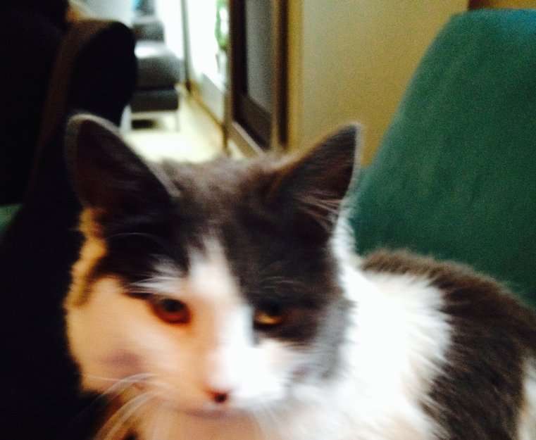 Hun er lysegår og hvit, halve nesen er grå, resten er lyst. Hun er resservert ovenfor mennesker, men veldig nyskjerrig på dører som står åpne.