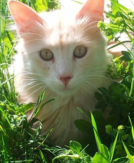 Han er en 5 år gammel tyrkisk angora med lilla halsbånd med navn og nr på.