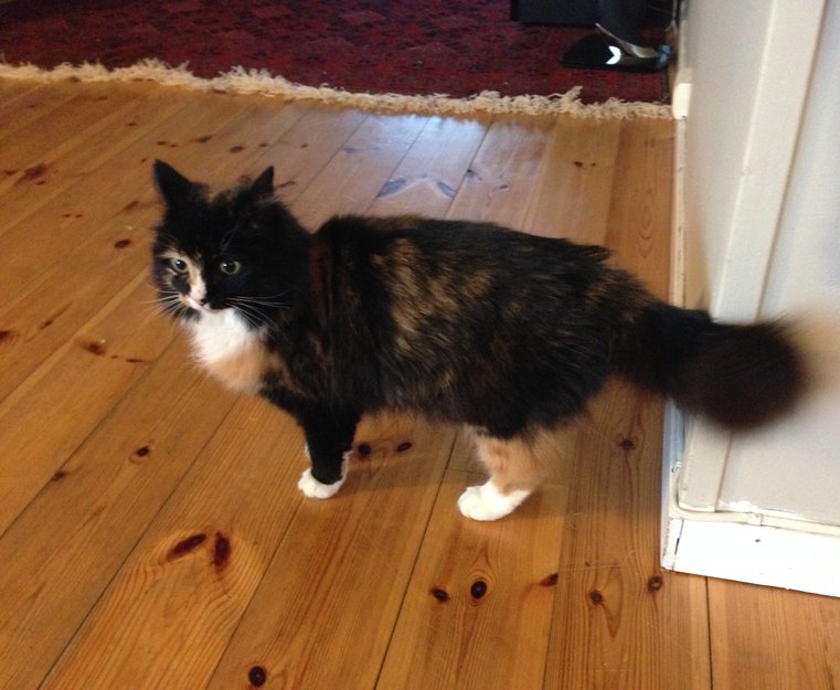 Den sto plutselig utenfor huset vårt, og ville ikke dra. Den lå utenfor døra vår og kikket inn. Etter et par dager slapp vi den inn og ga den mat. Og nå føler den seg hjemme her. Den er veldig fin og veldig koselig. Men det er sikkert noen som savner den? Vi har sendt lapper med bilde til alle naboer og satt opp annonse på butikkene. Men ingen har kontaktet oss.
