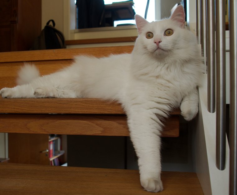 Stor, hvit, langpelset. Har chip og ID-tatovering i øret.