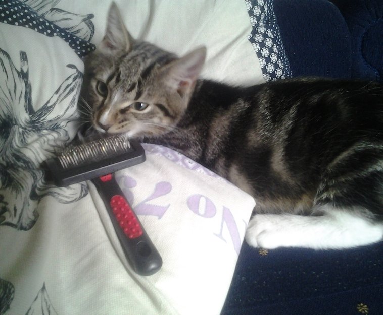 Den er spraglete 6mnd..sort , brun, og litt hvitt på potene og under haken.