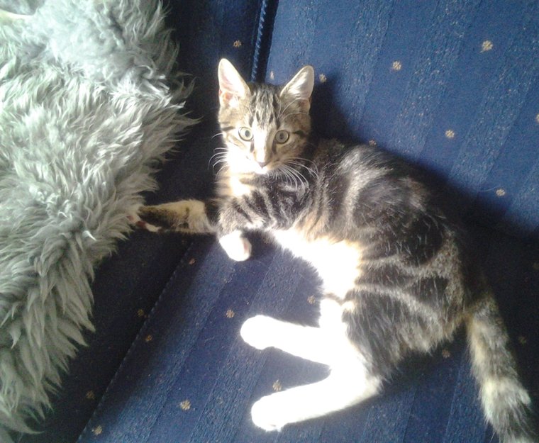 Spraglete pels, med hvite bakben og buk, er ca. 6 mnd. gammel