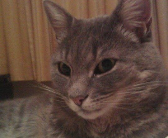 Han er grå (stripete), han kan være litt redd ukjente mennesker men når han blir kjent med deg så er han veldig kosen av seg.