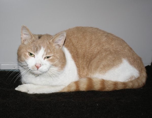 Rød og hvit hannkatt med rødtigrete hale. Snill og kosete.