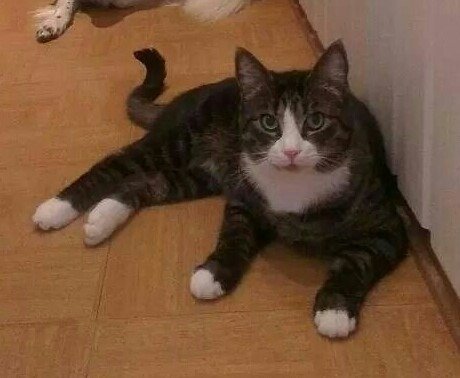 Hvite labber, hvitt bryst, hvit snute, ellers tigerstripet.