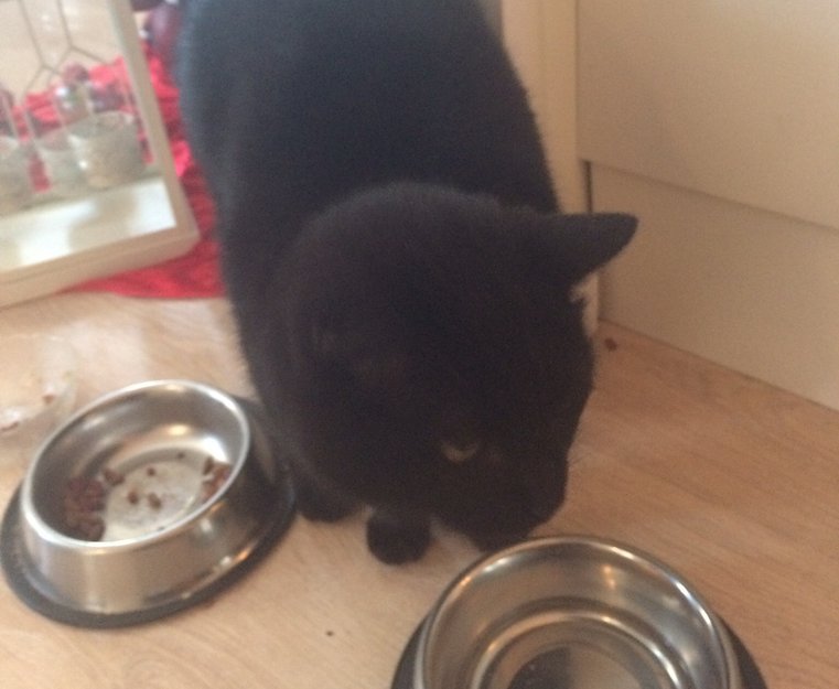 Katten er helt svart litt kort hale i forhold til mine egne katter.