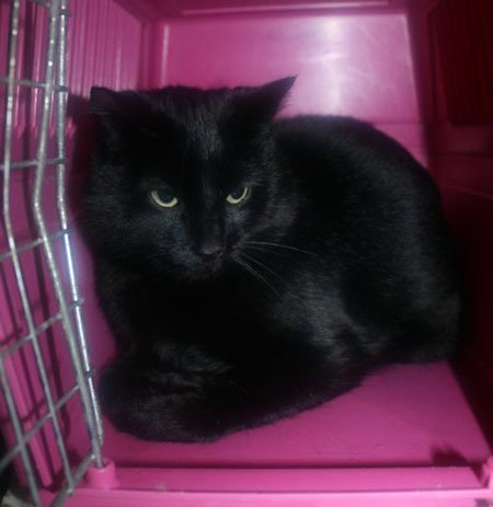 Snill og tillitsfull ukastrert hannkatt. Helsort med korthåret pels. Hadde på seg et SORT HALSBÅND MED PERLER når han ble tatt inn.