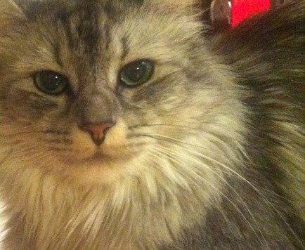 Ikke så stor langhåret katt som har et litt slitt sølv halsbånd og chip i nakken.