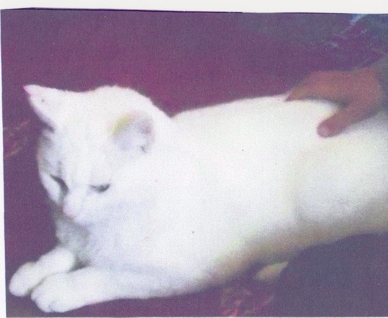 Pusen er meget menneskekjær og elsker kos. den har et hakk i høyre øre og er døv.