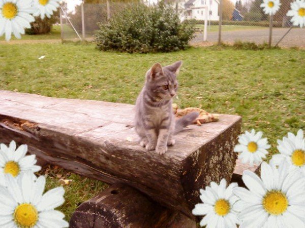 Liten hunnkatt med svarte og gråstripete på ryggen. gråhvit mage med prikker.