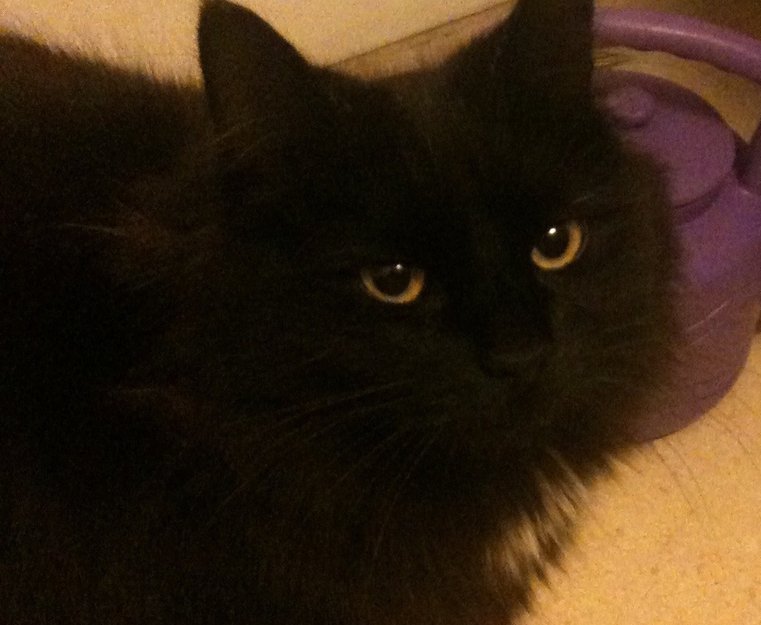 Kastrert hannkatt født 9.3.09 med svart halvlang pels med litt hvitt på brystet. Litt bredt ansikt med gule øyne. Det svarte under potene har blitt delvis rosa. Han har sped mjauing. Normal til tynn kroppsbygning.