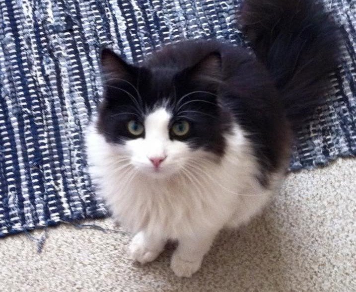 Sort/hvit med lang pels. Rosa nese. Stor fluffy hale.